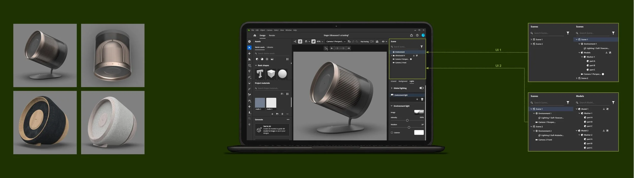 Adobe Substance 3D is looking to implement new product features that will attract Industrial Designers as a new User base. The previous Generative User Research Analysis indicated that Industrial Designers would like Adobe Stager Program to gain the functionality of being able to setup up multiple scenes, each with its own camera and light setup.