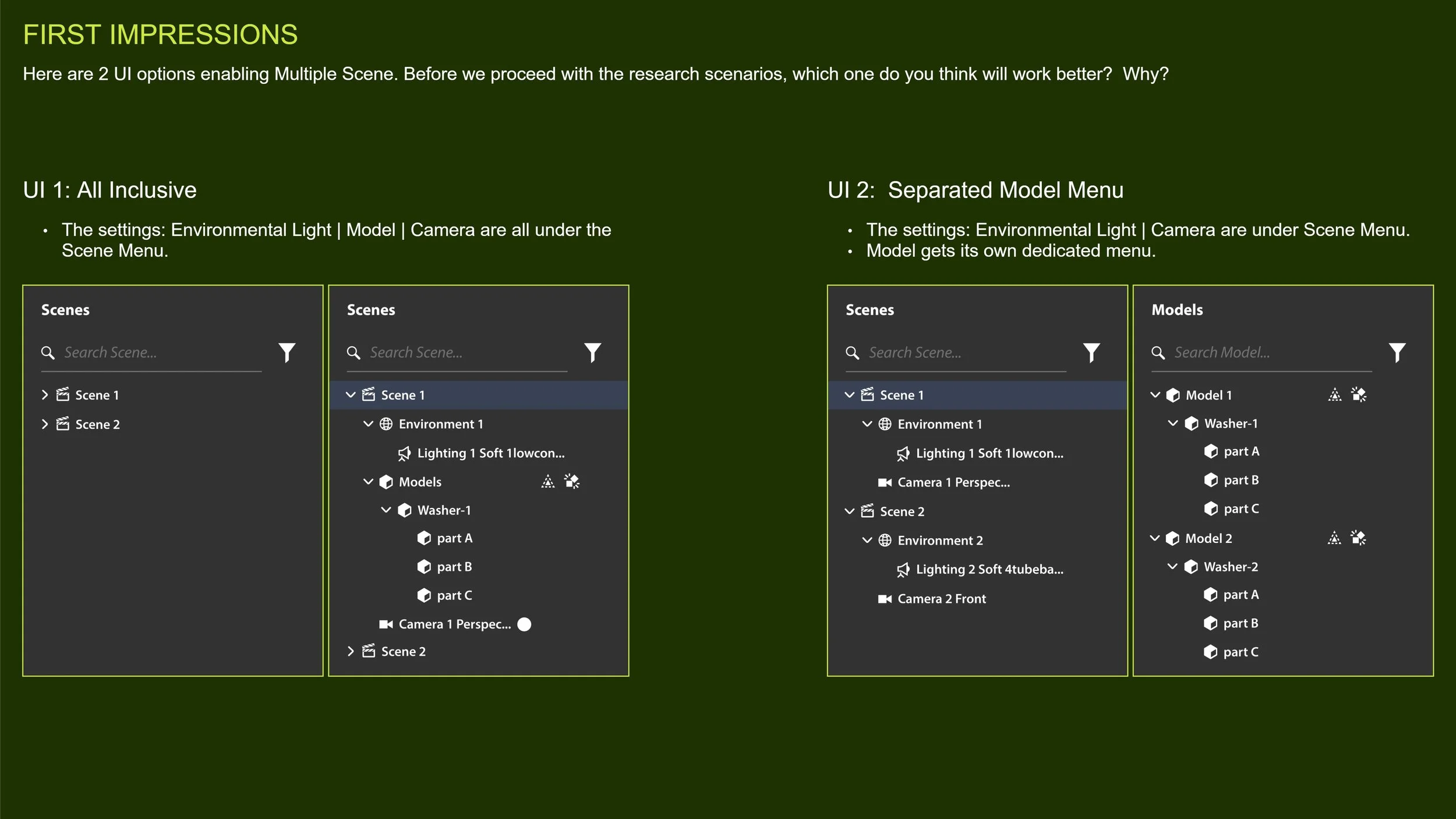 This (Phase 2) research will focus on testing which of the 2 iterations of Multi-Scene UI implementation resonates with the Industrial Design users the most.