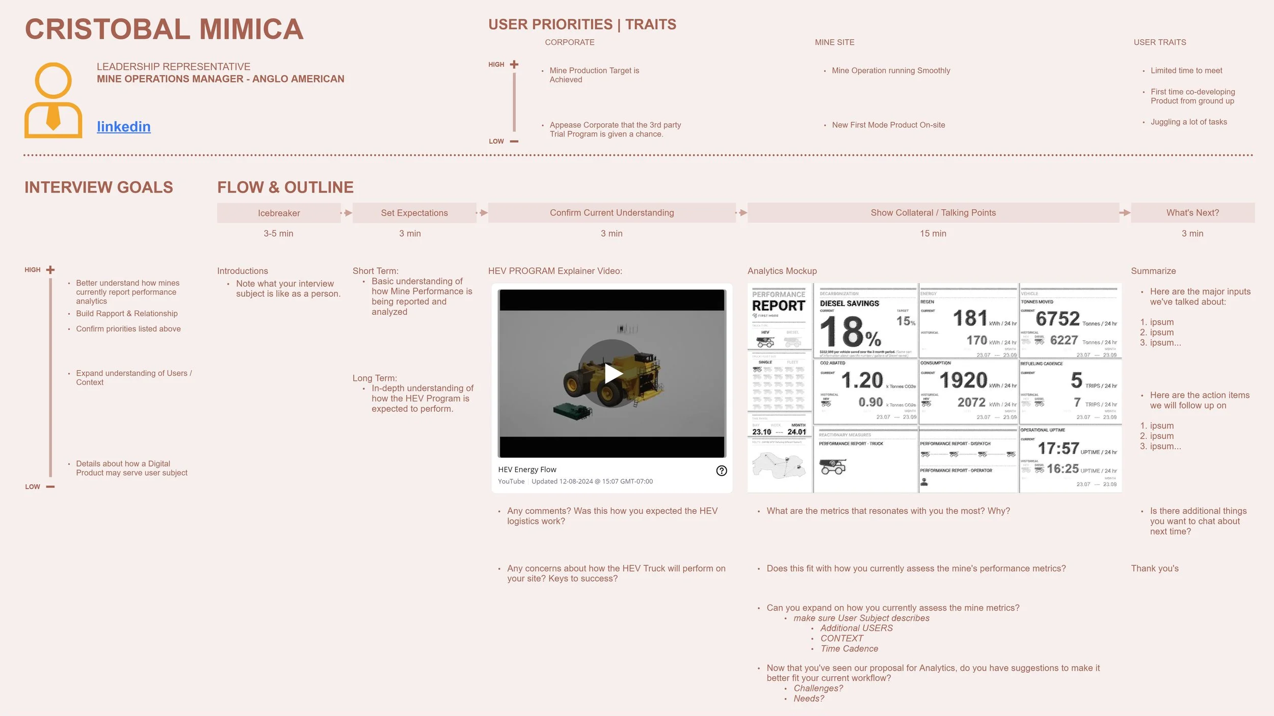 Set up 10 qualitative interviews, 6 of which are a mix of internal stakeholders w/ extensive mine-site working experience and mine personnel from a nearby Washington Mine. This is to compensate for limited customer stakeholder access.
